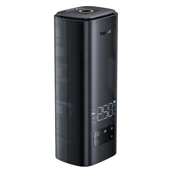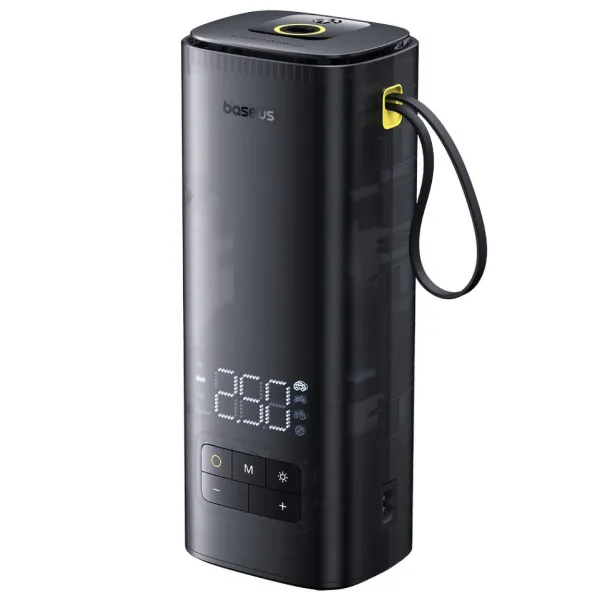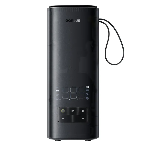 На корпусі розміщено дисплей, який відображає найважливішу інформацію, як-от: показник тиску під'єднаної шини, поточний обраний режим, рівень заряду компресора. Розташовані нижче кнопки забезпечують зручний доступ до найважливіших функцій пристрою. З їхньою допомогою можна вмикати та вимикати компресор насос автомобільний Baseus, регулювати тиск, вибирати автоматичний режим і вмикати ліхтарик.