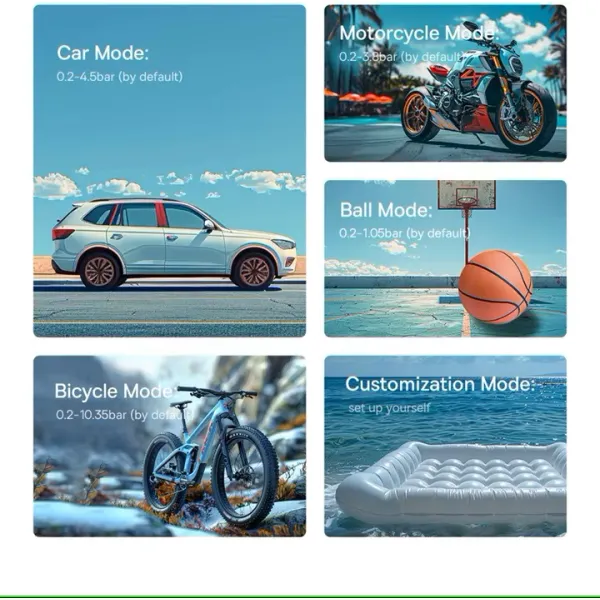Насос Baseus сумісний з різними шинами - з його допомогою можна накачати не тільки колеса автомобілів, а й мотоциклів, велосипедів і навіть м'ячі. Щоб повністю накачати одну шину (R19), потрібно приблизно 4.5 хвилини до повного тиску 2,5 бар. Достатньо одного натискання кнопки. Пристрій автоматично зупинить процес, коли тиск у шинах досягне встановленого значення.