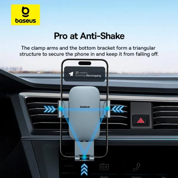 Гравітаційна технологія в авто тримачі телефона Baseus використовує вагу телефона для автоматичного притискання бічних затискачів, забезпечуючи стабільну та надійну фіксацію пристрою. Ця інноваційна функція дає змогу легко керувати пристроєм однією рукою, що ідеально підходить для водіння автомобіля.