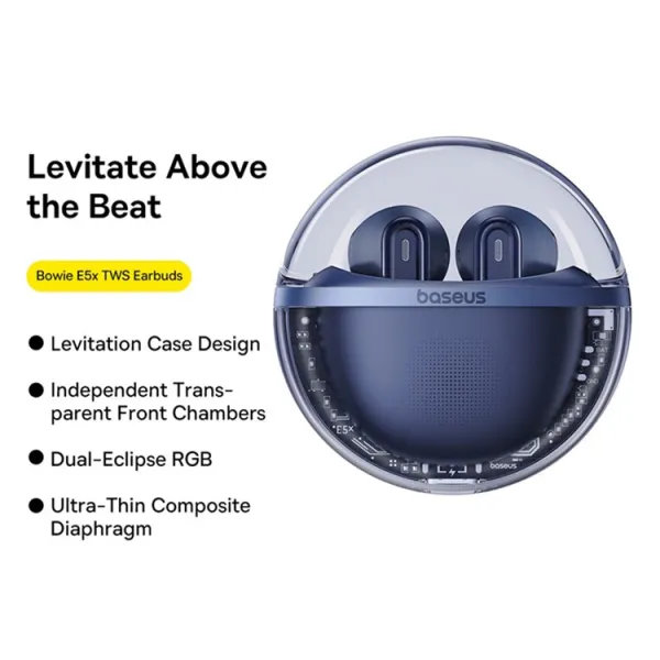 Bluetoothнавушники з мікрофоном Baseus Bowie E5x TWS це навушники з сучасним дизайном, що досягається завдяки конструкції, яка використовує прозорий купол для демонстрації внутрішньої електроніки, яка має такий вигляд, наче кишеня навушниківлевітіруетвсередині. Самі навушники також мають прозорий купол, під яким знаходиться гладка ультратонка діафрагма з поліуретану PEEK з синім колірним акцентом. Синє підсвічування, вмонтоване в чохол, завершує стильний образ і допомагає знайти чохол уночі та розмістити навушники у відповідних відділеннях.