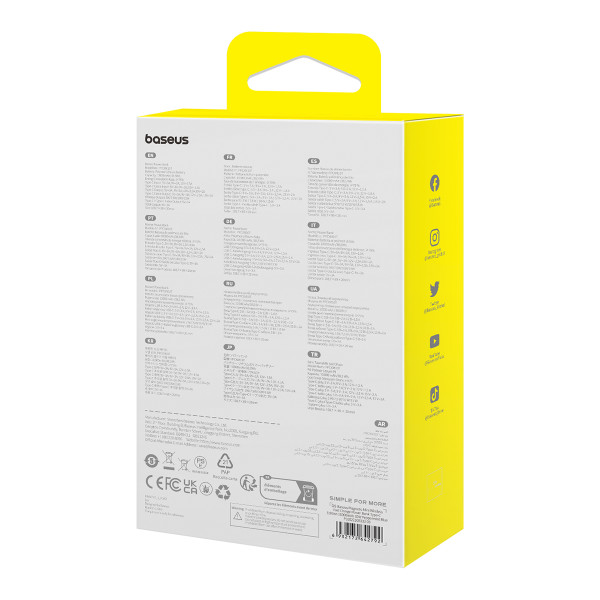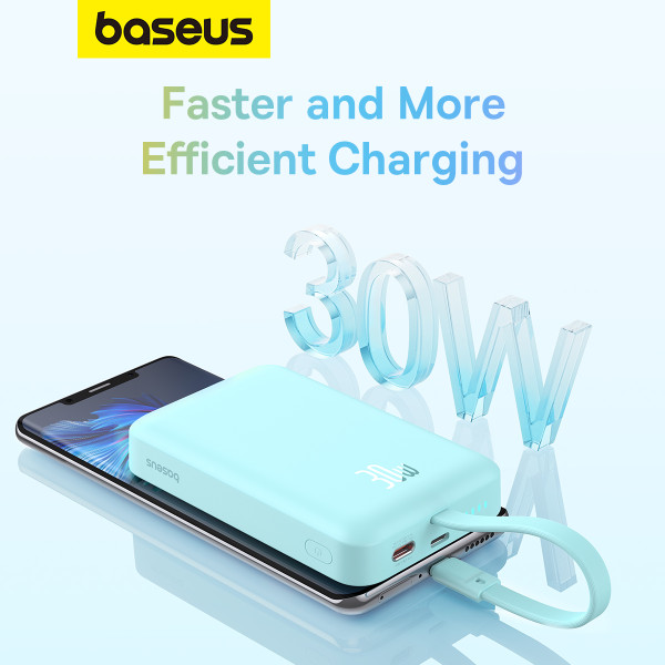 Повна перезарядка самого Павер банку Baseus відбувається всього за приблизно 1.5 години при використанні зарядного адаптера з підтримкою Power Delivery (PD) і потужністю 20W та використанні роз'єму USB Type-CPD або вбудованого кабелю Type - C.