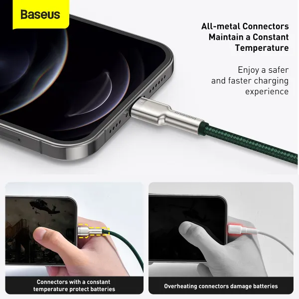 •Кабель для смартфона Baseus Cafule Metal Cable USB to Lightning 2.4A 2m має силу струму 2.4А, це дозволить заряджати гаджети дуже швидко. Що стосується передачі даних, швидкість може досягати 480 Мбіт/сек, завдяки високій пропускній здатності кабелю.