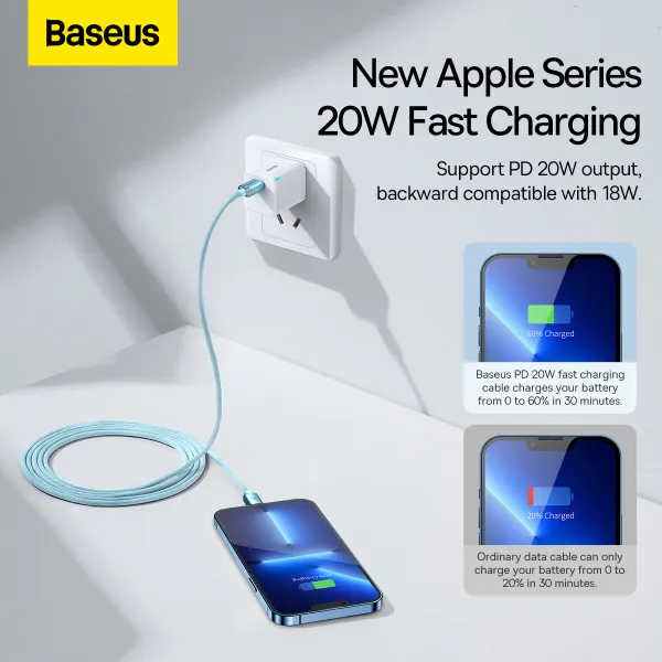 Кабель Baseus Crystal Shine Series Fast Charging Data Cable Type-C to Lightning PD 20W 2m призначений для зарядки і синхронізації більшості пристроїв від Apple, таких як iPhone, iPad, iPod, AirPodsз роз'ємом LightningВін підтримує зарядку за новою технологією Power Delivery потужністю 20 Вт і передачу даних зі швидкістю 480 Мбіт/с. Наприклад, за допомогою технології швидкого заряджання PD 20W, iPhone 13 заповнює заряд на 60% усього за півгодини.
