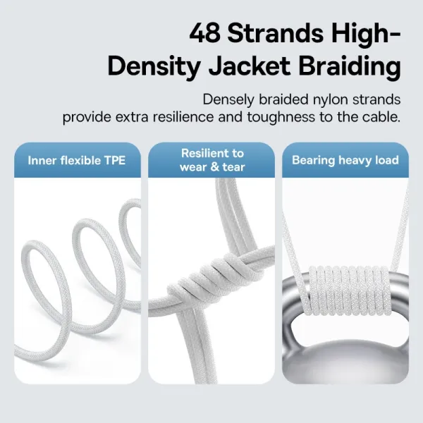 Обплетення з нейлонових волокон, щільно обмотане навколо кабелю, забезпечує додатковий захист, гнучкість і міцність. Така конструкція допомагає зменшити стирання і підвищує довговічність, дозволяючи легко справлятися з повсякденним використанням.