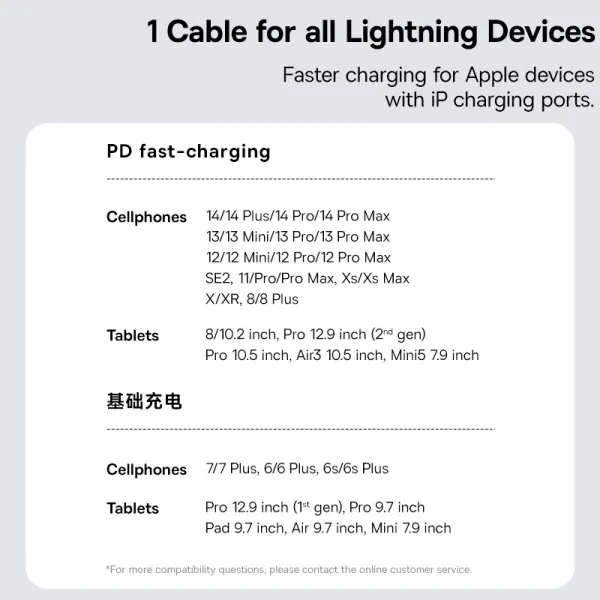 Зарядний кабель Baseus з інтерфейсом Lightning – винайдений фірмою Apple спеціально для своєї техніки. Даний зарядний провід підійде для iPhone 14, iPhone 14 Plus, iPhone 14 Pro, iPhone 14 Pro Max, iPhone 13 Pro MAX, iPhone 13 Pro, iPhone 13, iPhone 13 mini, iPhone 12 PRO MAX, iPhone 12 PRO, iPhone 12 Mini, iPhone 12, iPhone 11 PRO MAX, iPhone 11 PRO, iPhone 11, iPhone SE 2020, iPhone XS MAX, iPhone XS, iPhone XR, iPhone X, iPhone 8 Plus, iPhone 8, iPhone 7 Plus, iPhone 7, iPhone SE, iPhone 6S Plus, iPhone 6S, iPhone 6 Plus, iPhone 6.