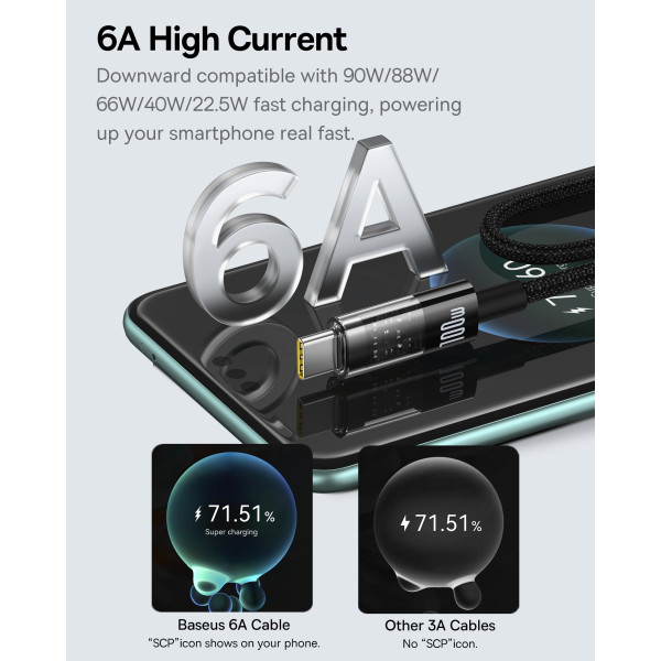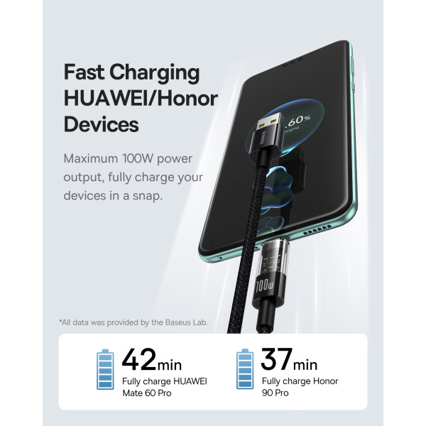 Кабель Baseus Gem Series Fast Charging Data Cable USB to Type-C 100W 20V 5A 1m підтримує зарядку потужністю 100 Вт PD і забезпечує швидкість передачі даних до 480 Мбіт/с.