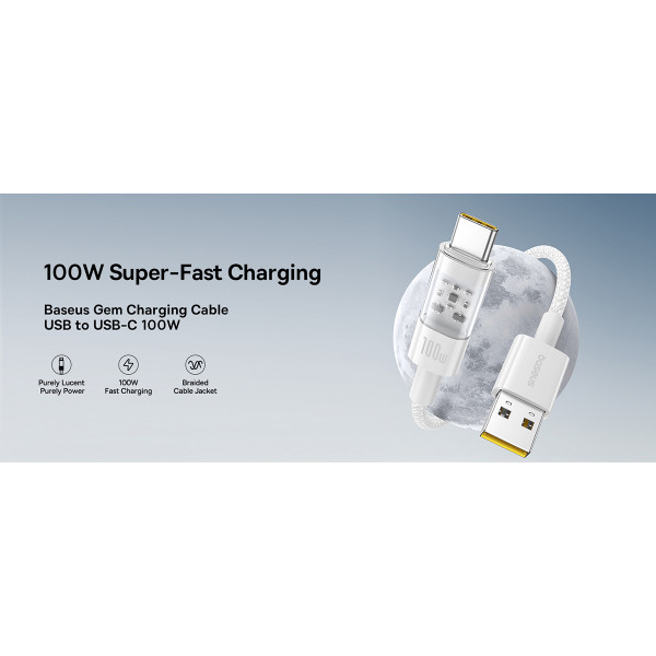 Кабель Baseus Gem Series Fast Charging Data Cable USB to Type-C 100W 20V 5A 2m підтримує зарядку потужністю 100 Вт PD і забезпечує швидкість передачі даних до 480 Мбіт/с.