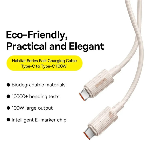 Кабель USB - type-c 100w Baseus Habitat Series Fast Charging Data Cable USB to Type-C 100W 20V 5A 2m стійкий до подряпин і плям і не жовтіє з часом.
