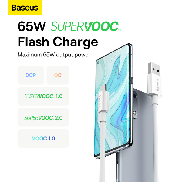 Кабель Baseus Superior Series Fast Charging Data Cable USB to Type-C 65W SUPERVOOC 2m підтримує зарядку потужністю 65 Вт і забезпечує швидкість передачі даних до 480 Мбіт/с.