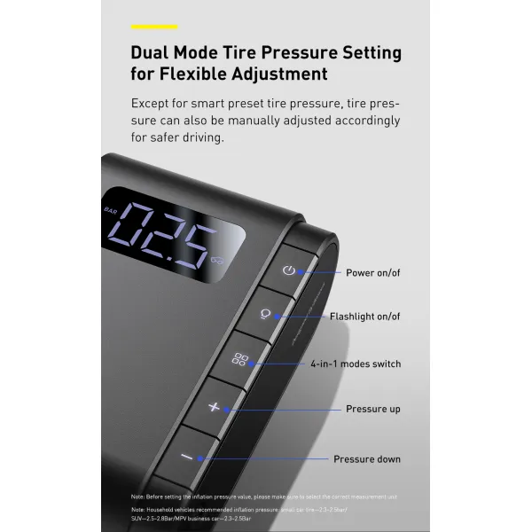 • Акумуляторний компресор Baseus Dynamic Eye Inflator Pump включає 4 встановлені режими - автомобіль, мотоцикл, велосипед і м'яч - з уже виставленими значеннями тиску. Крім того, при виборі встановленого режиму рівень тиску можна змінити. Наприклад, при виборі режиму "Автомобіль", компактний компресор за замовчуванням виставить тиск в 2,5 Бар, але натискаючи кнопки + і - можна вибрати будь-який інший тиск. Обраний режим відображається на екрані та управління кнопками максимально просте, логічне, зручне і буде інтуїтивно зрозумілим будь-якій людині.