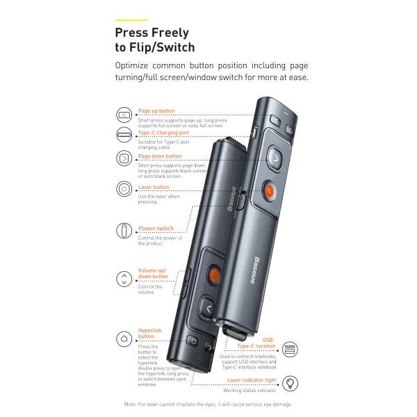 Досягніть максимального ефекту від презентації за допомогою презентер лазерної указки Baseus Orange Dot Wireless Presenter Red Laser. Вільно переміщайтеся, змінюйте слайди на відстані до 20 метрів і використовуйте лазерну указку на відстані до 100 метрів для відображення деталей.