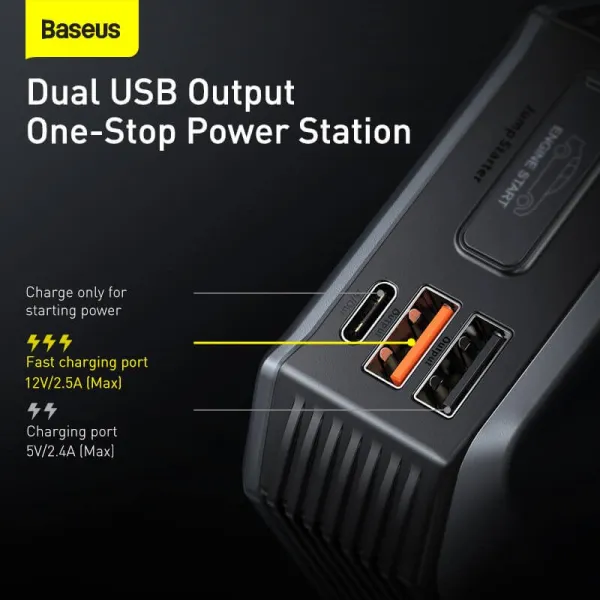 •Пусковий пристрій Baseus MAX Car Jamp Starter Super Energy 3in1 – багатофункціональний гаджет для автолюбителів, у якому поєднано такі функції: