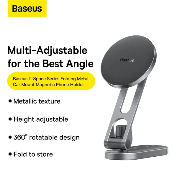 Созданный из алюминиевого сплава, этот гладкий черный держатель для телефона в машину Baseus T-Space Series Folding Metal Car Mount Magnetic сочетает в себе изысканность и долговечность, предлагая прочную матовую основу для любого салона автомобиля. Держатель Baseus не будет занимать много места в автомобиле – благодаря компактным размерам.
