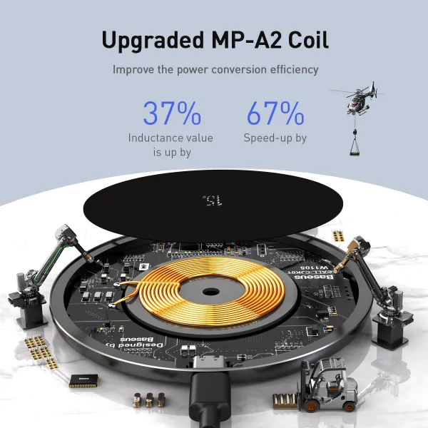 •Беспроводная зарядка автоматически распознает подключенный гаджет, и определяет оптимальные параметры, которые необходимы для его быстрой и безопасной зарядки. Для мобильных телефонов выходная мощность будет равна от 5 до 15 Вт, а для наушников понижена до 2.5 Вт.