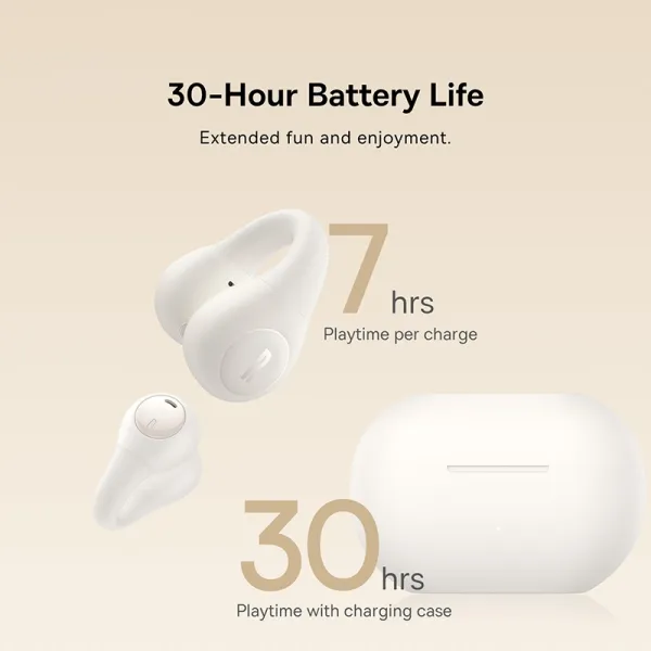 Открытые беспроводные наушники Baseus Bass 15 Clip Open-Ear Wireless TWS Earbuds обеспечивают до 7,5 часов использования каждого наушника (на громкости 50% от мах) и 30 часов с зарядным кейсом (на громкости 50% от мах). Зарядный футляр можно полностью зарядить всего за 1 час.