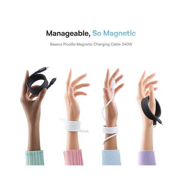 Кабель Baseus PicoGo Magnetic Liquid Silicone Series Fast Charging Data Cable Type-C to Type-C 240W 1m - это магнитный самозакручивающийся кабель USB-C сочетает в себе высокоскоростную зарядку 240 Вт с элегантным магнитным самозакручивающимся дизайном, обеспечивая максимальное удобство и эффективность. Изготовленный из высококачественного жидкого силикона, этот прочный кабель создан для гибкости и устойчивости, выдерживая более 10 000 изгибов. Идеально подходит для зарядки широкого спектра устройств — от iPhone и MacBook до Samsung Galaxy и Google Pixel — этот универсальный кабель также поддерживает передачу данных со скоростью 480 Мбит/с, что позволяет вам синхронизировать и заряжать одновременно.