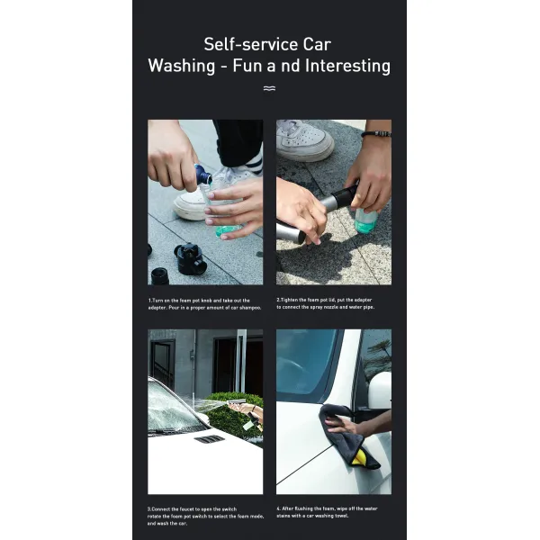 Набор для мойки автомобиля для минимойка Baseus Simple Life Car Wash Spray Nozzle – это фирменный набор для ухода за автомобилем, предназначенный для использования с минимойка Baseus Simple Life Car Wash Spray Nozzle. Присоединяясь к пульверизатору, он обеспечивает подачу воды уже смешанной с моющим средством. А дополнительные аксессуары позволяют довести процесс наведения чистоты до совершенства.