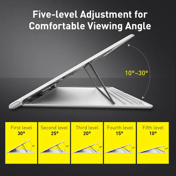 •Пятиуровневая регулировка наклона подставки позволяет выбрать наиболее удобный угол обзора для комфортной работы на ноутбуке для человека любого роста: