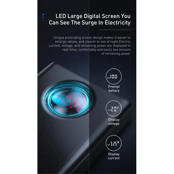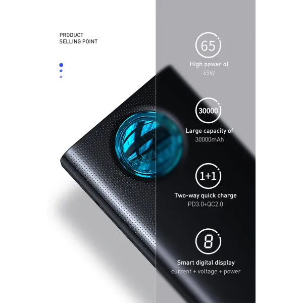 •Baseus Amblight 30000mAh 65W - это мощная батарея с огромной емкостью 30000 мАч, стильным внешним видом и многочисленными портами, которые позволяют возобновлять энергию нескольких приборов одновременно. Данный Павербанк поддерживает современные стандарты быстрой зарядки – Quick Charge 3.0, Power Delivery 3.0, FCP, SCP, AFC, благодаря которым процесс восстановления заряда Ваших аксессуаров ускоряется в несколько раз. C помощью технологии Power Delivery, iPhone X восполняет заряд на 50 процентов всего за полчаса. Обратите внимание, что для этого вам понадобится кабель с поддержкой PD. И с помощью технологии SCP 22.5W, HUAWEI P30 восполняет заряд на 58 процентов тоже всего за полчаса. Также, поддерживает технологию быстрой зарядки для смартфонов Samsung – например, Samsung S20 с помощью технологии Ultra 45W Quick Charge восполняет заряд на 100 процентов всего приблизительно за 57 минут.