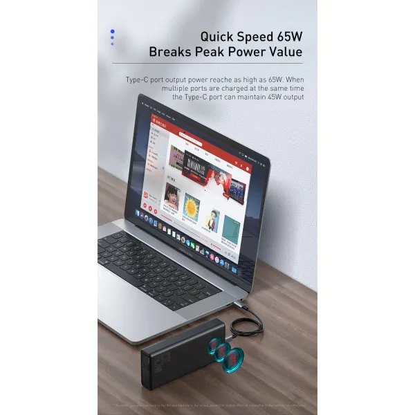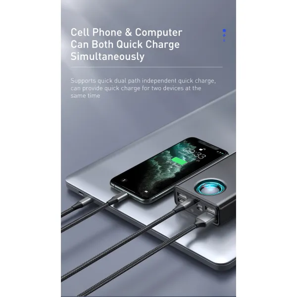 •Baseus Amblight станет отличным решением для зарядки Ваших устройств при отсутствии розеток. Емкости в 30000 мАч хватит для полной зарядки нескольких устройств и небольшой вес в 550 граммов, позволяет брать Baseus Mulight 65W с собой куда угодно.