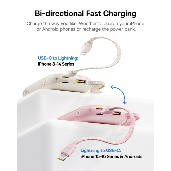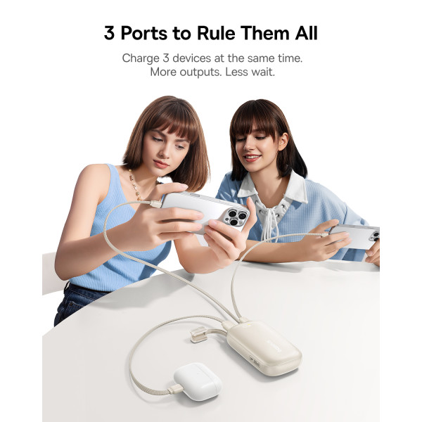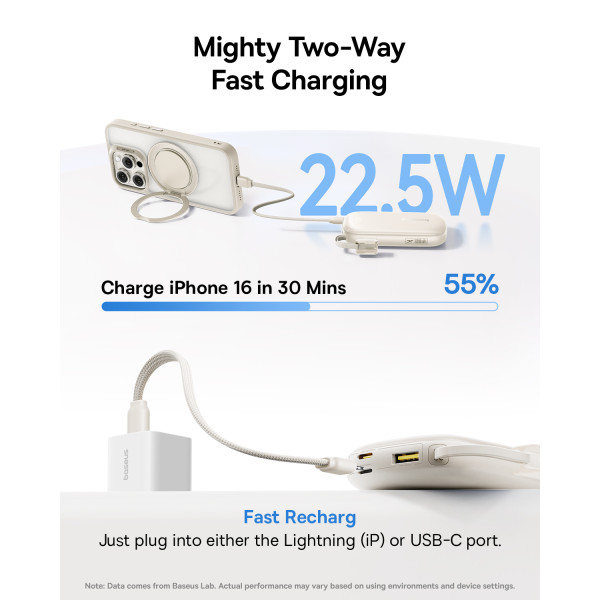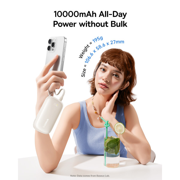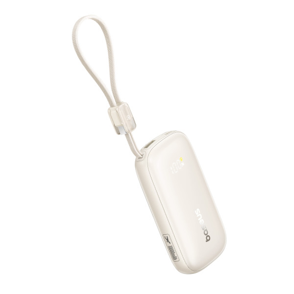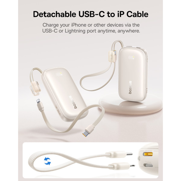 Главная инновация этой модели Павербанка Baseus – съемный кабель-трансформер. В производном положении он служит удобным ремешком для переноски, а когда нужно зарядить гаджет – превращается в универсальный инструмент для зарядки как iPhone (Lightning), так и Android или iPhone 15/16/17 (USB-C).