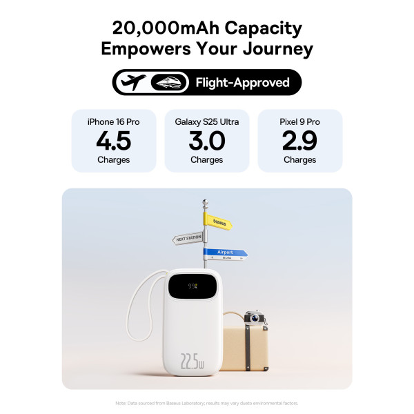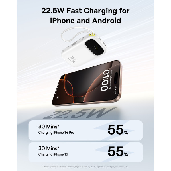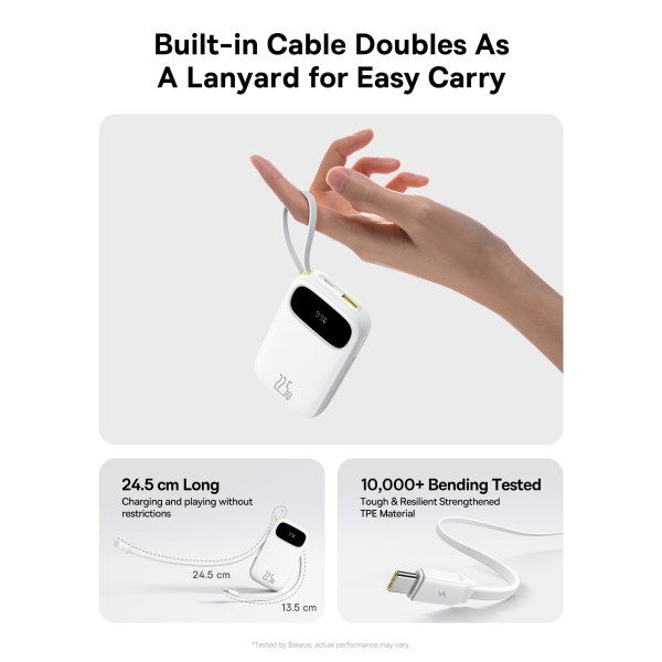 На лицевой стороне корпуса Powerbank Baseus EnerFill FC31 Qpow3 Dual-Cable 20000mAh 22.5W с технологией QC3.0+PD3.0 и iP 20W+Type-C 22.5W кабелем расположен встроенный дисплей, который в режиме реального времени показывает уровень заряда в процентах.