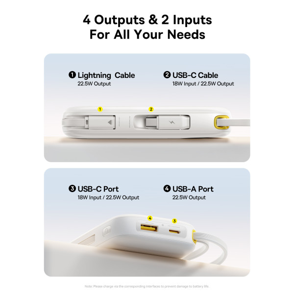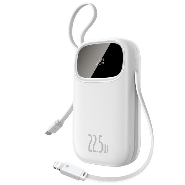 Power bank Baseus EnerFill FC31 Qpow3 Dual-Cable 20000mAh 22.5W с технологией QC3.0+PD3.0 и iP 20W+Type-C 22.5W кабелем - это компактный пауэрбанк емкостью 20000 мАч с двумя встроенными кабелями: USB-C и Lightning. Всего у него два порта: один выход USB-A и один выходной/входной порт USB-C. Павербанк Baseus поддерживает двунаправленную быструю зарядку с 20 Вт, а также поддерживает такие протоколы быстрой зарядки, как: