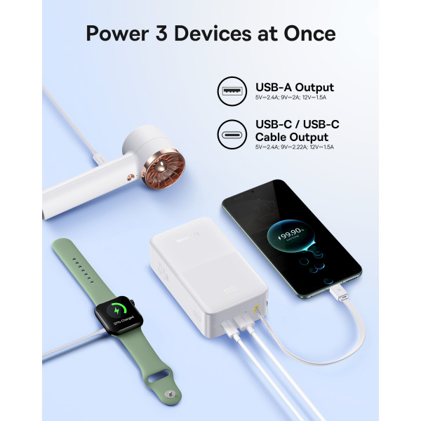 Павер банк Baseus предназначен для работы с большинством популярных устройств с разъемами USB-C. Не только для устройств Apple и телефонов Android, но и для беспроводных колонок, фотооборудования, фонарей и т.д.