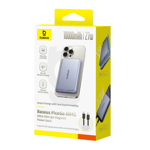 Power bank УМБ Baseus PicoGo AM41 Ultra-Slim Qi2 Magnetic 10000mAh 27W QC3.0+PD3.0 - это уникальная батарея для беспроводной зарядки вашего смартфона с емкостью 10000 мАч, стильным внешним видом, портом USB Type-C и беспроводной зарядкой Qi2, позволяет возобновлять энергию двух девайсов одновременно. Компактный, элегантный, инновационный и многофункциональный павербанк Базеус изготовленный из высококачественных материалов.