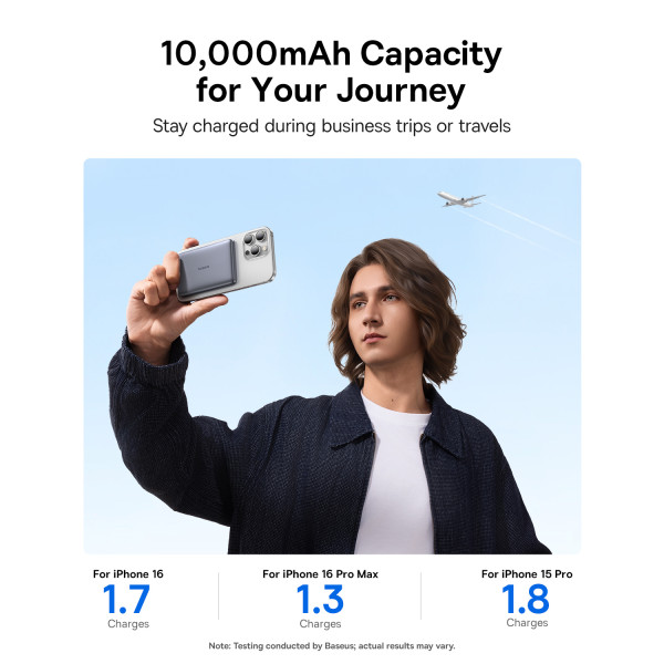 Батареи мощностью 10000 мАч хватит для зарядки, например: до 1,8 раза iPhone 15 Pro, до 1,7 раза iPhone 16, до 1,3 раза iPhone 16 Max. Повербанк Baseus поддерживает технологию быстрого заряда с мощностью 20 Вт.