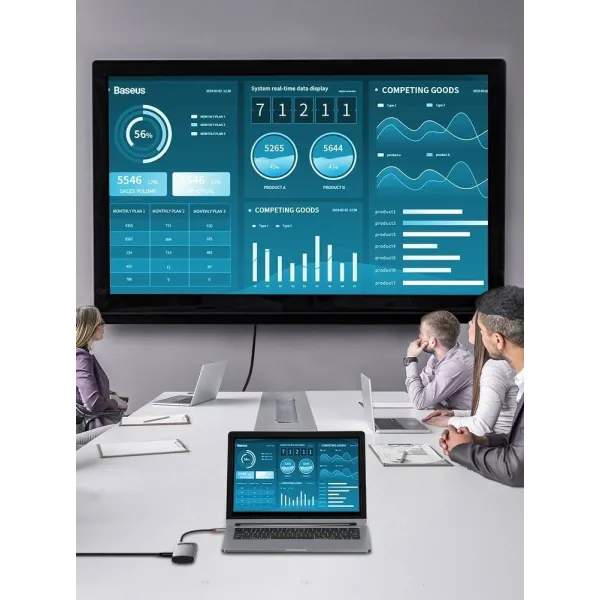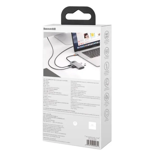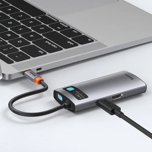 Адаптер Baseus 4in1 Metal Gleam 4-Port Type-C HUB Adapter имеет компактный размер и изящную форму. Он изготовлен из прочного материала, который отлично отводит тепло изнутри. Подключение к ноутбуку осуществляется с помощью небольшого кабеля с разъемом USB-C на конце.