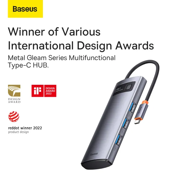 Адаптер Baseus 4in1 Metal Gleam 4-Port Type-C HUB Adapter имеет компактный размер и изящную форму. Он изготовлен из прочного материала, который отлично отводит тепло изнутри. Подключение к ноутбуку осуществляется с помощью небольшого кабеля с разъемом USB-C на конце.