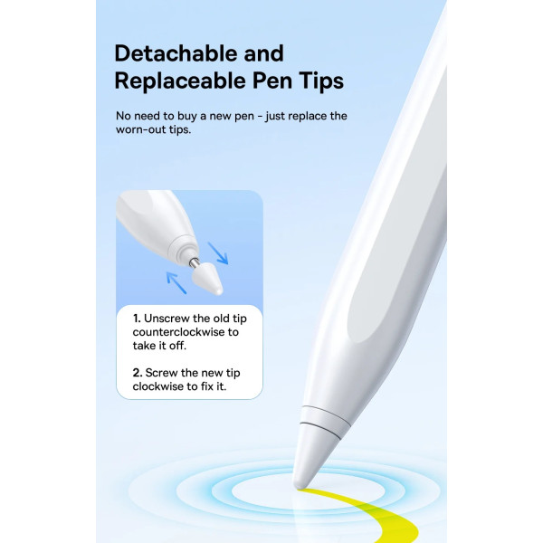 У комплект входить змінний наконечник. Стилус Baseus Writing 2 Series Plug-Type USB-C Active Wireless Version з LED індикатором 12 годин овирізняється увагою до кожної деталі, чому він зобов'язаний як вищезгаданій елегантності, так і практичному використанню.