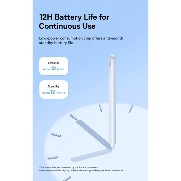 Для економії енергії стилус автоматично вимикається через 10 хвилин бездіяльності. Повного заряду вистачає на 12 год безперервного використання. Час роботи в режимі очікування становить до 12 місяців. Про те, що пристрій працює справно, повідомить світлодіодний індикатор. Також, світлодіодний індикатор інформує нас про рівень заряду пристрою.
