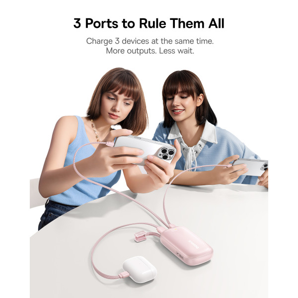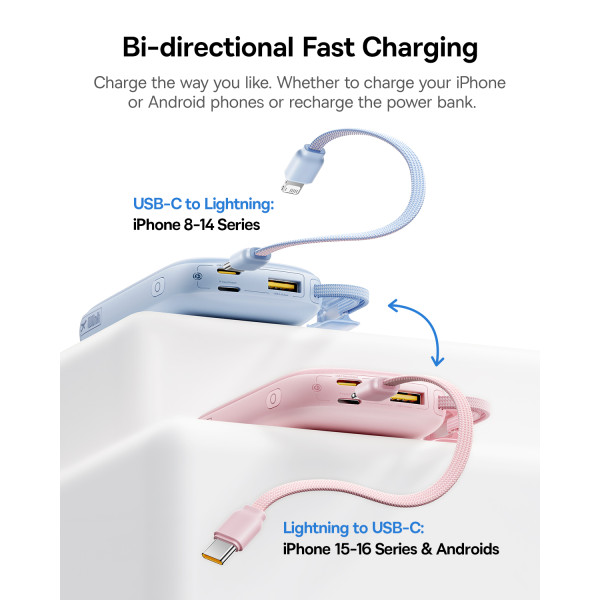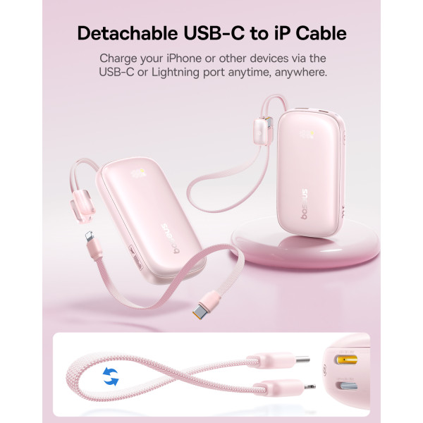 Головна інновація цієї моделі Павербанка Baseus – знімний кабель-трансформер. У вихідному положенні він служить зручним ремінцем для перенесення, а коли потрібно зарядити гаджет – перетворюється на універсальний інструмент для зарядки як iPhone (Lightning), так і Android або iPhone 15/16/17 (USB-C).