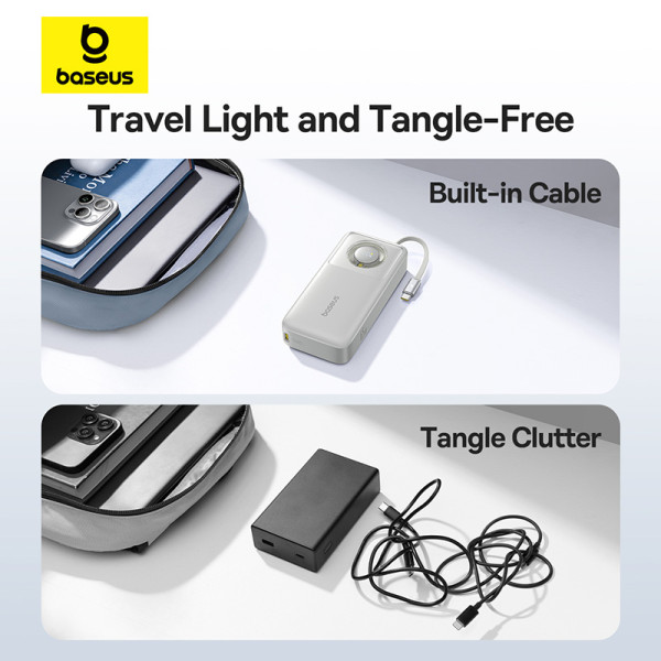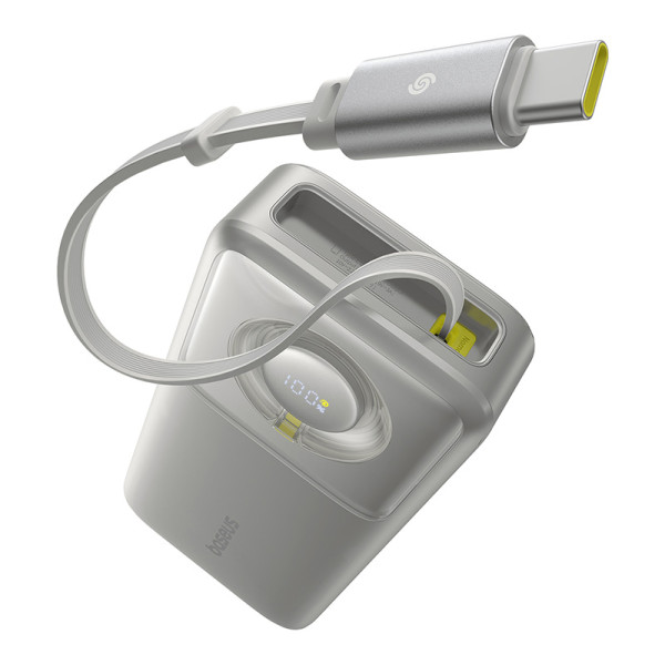 Power bank Baseus Free2Pull with Retractable Cable 20000mAh 65W з технологією QC3.0+PD3.0 та Type-C кабелем 60W це компактний пауербанк ємністю 20000 мА·год з вбудованим кабелем USB-C довжиною 0,7 м. Потягніть за висувний кабель USB-C, щоб відрегулювати довжину кабелю, а потім знову потягніть його, щоб втягнути і прибрати. Попрощайтеся з заплутаними кабелями та безладом під час заряджання. Також у нього передбачений один вихідний/вхідний порт USB-C. Павербанк Baseus для ноутбука підтримує двонаправлену швидку зарядку 65 Вт, а також підтримує такі протоколи швидкої зарядки, як: