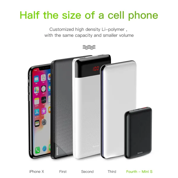 • Baseus Mini S Digital Display - це компактний, елегантний, інноваційний і багатофункціональний блок живлення ємністю 10000 мАг, виготовлений з високоякісних матеріалів і оброблений напівматової текстурою. Даний Павербанк підтримує сучасний стандарт швидкої зарядки - Power Delivery, завдяки якому процес відновлення заряду Ваших аксесуарів прискорюється в кілька разів. Зверніть увагу, що для цього вам знадобиться кабель з підтримкою PD.