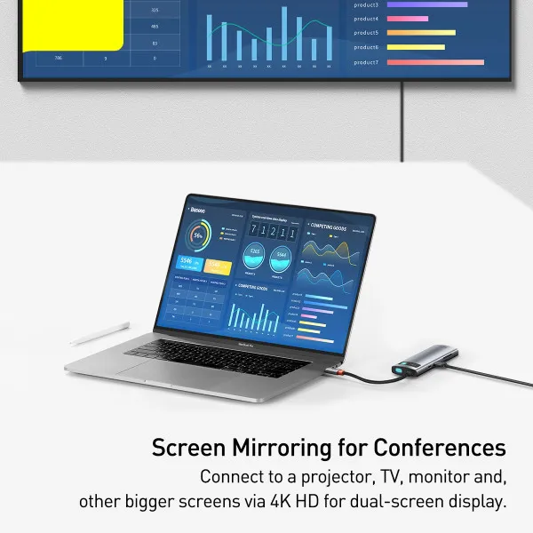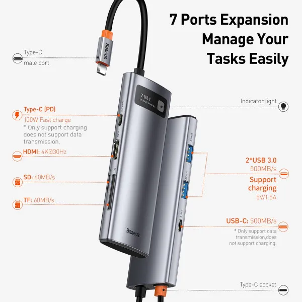 На вашому комп'ютері недостатньо портів для підключення додаткових пристроїв? Рішенням стане високошвидкісний концентратор Baseus 7in1 Metal Gleam 7-Port Type-C HUB Adapter з двома портами USB-A, що працюють за стандартом USB 3.0, одним Type-C, що виконує тільки функцію порту живлення 100 Вт і одним Type-C, що виконує лише функцію передавання даних 500 МБ/с, та одним HDMI портом, що дає змогу насолоджуватися відмінною якістю зображення 4K, а також кардрідер для карт пам'яті TF та SD.