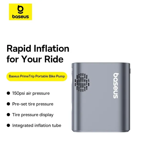 Велосипедисти, які шукають найкращий повітряний насос для велосипеда з цифровим дисплеєм, звертають увагу на Насос для велосипеда електричний Baseus PrimeTrip Series Portable Bike Pump акумуляторний 1750mAh 45W завдяки його елегантному, компактному дизайну та потужній продуктивності. Завдяки безлічі варіантів насадок і простому у використанні інтерфейсу це універсальний насос, що підходить для різних типів шин. Його портативність і ефективність роблять його фаворитом для тих, хто шукає надійний і найкращий велосипедний насос для велоспорту, здатний задовольнити всі потреби в накачуванні шин на ходу.